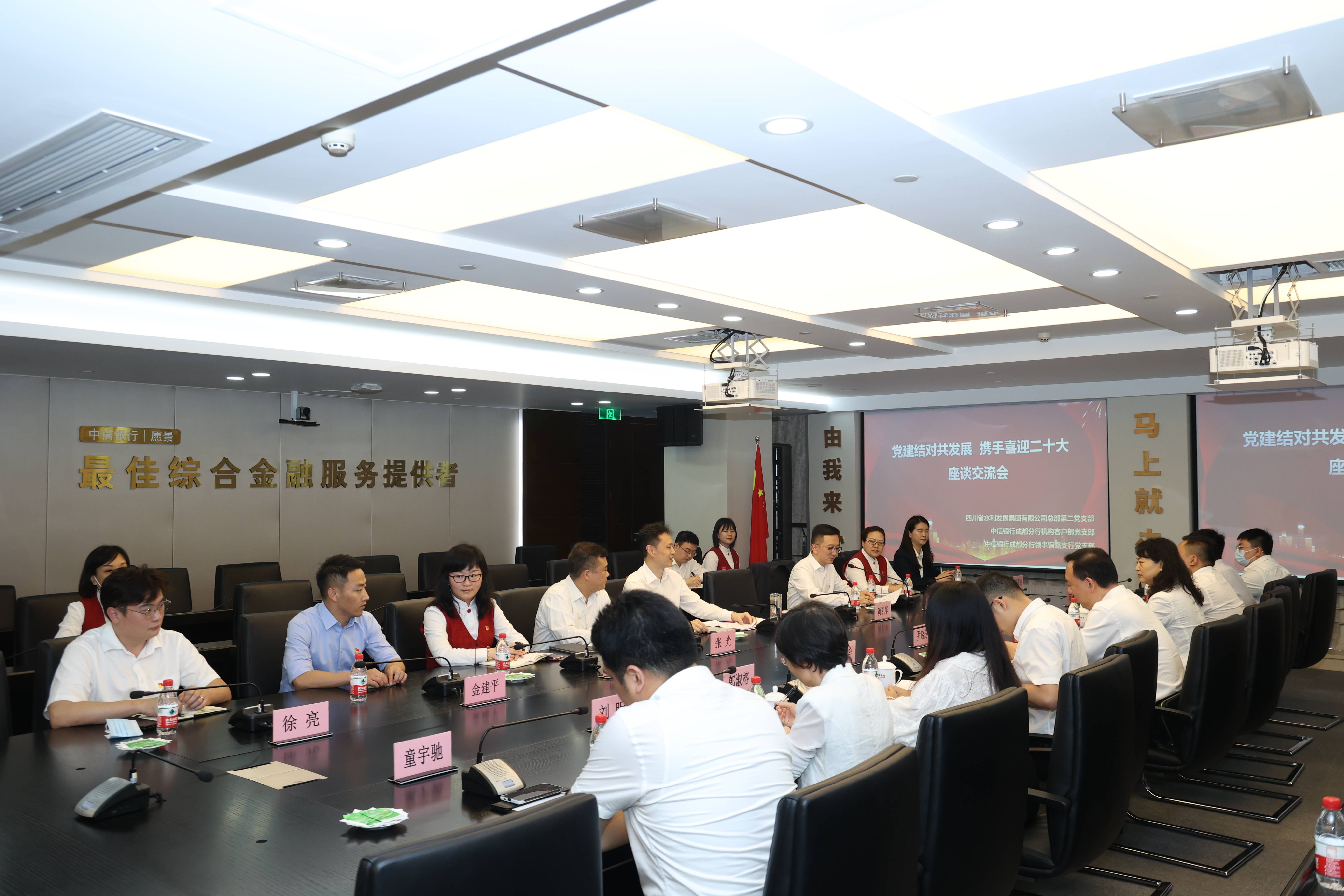 活動雙方共同參觀了中信銀行成都分行行史館,并以“黨建結對共發展、攜手喜迎二十大”為主題開展聯合黨建座談會。雙方圍繞“黨建引領集團水利事業”與“黨建引領銀企合作”進行了深入討論與交流。中信銀行支部以“成都公園城市新發展理念”、“展望中信”為主題進行了交流,集團二支部就“在黨建引領下圍繞四川水利事業發展凝心聚力,迎難而上”為主題進行交流。大家一致認為,我們一要深入學習貫徹習近平總書記關于國資國企改革發展和黨的建設重要論述,二要深入貫徹落實中央、省委重要會議精神和全國“兩會”精神及上級重大會議精神,三要認真學習宣傳貫徹黨的二十大和省第十二次黨代會精神,以支部聯合黨建為契機,深入交流、相互借鑒、共同進步,落實國有企業黨建工作的創新嘗試,鞏固深化全面戰略合作關系,共鋪服務之路、共繪發展藍圖。