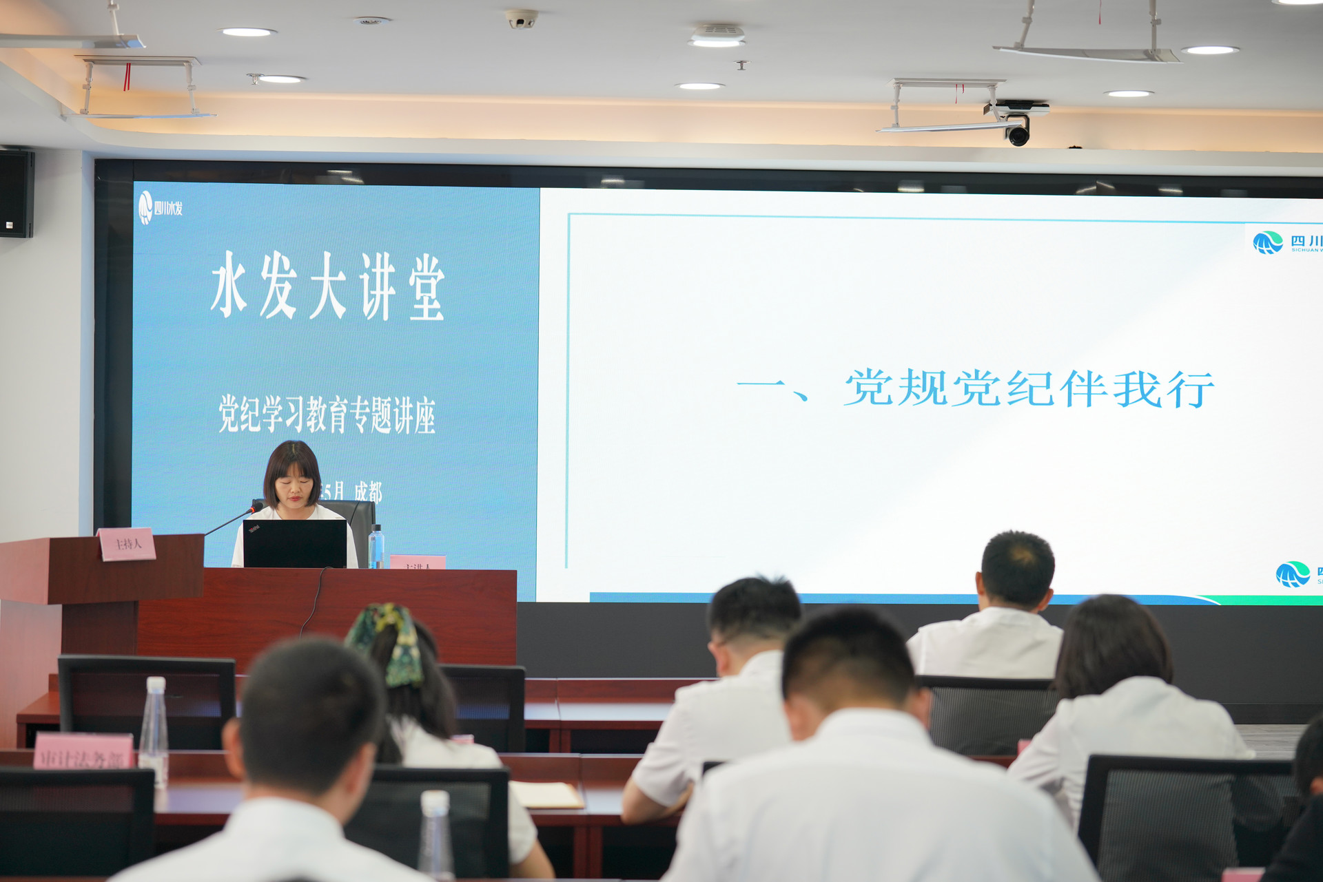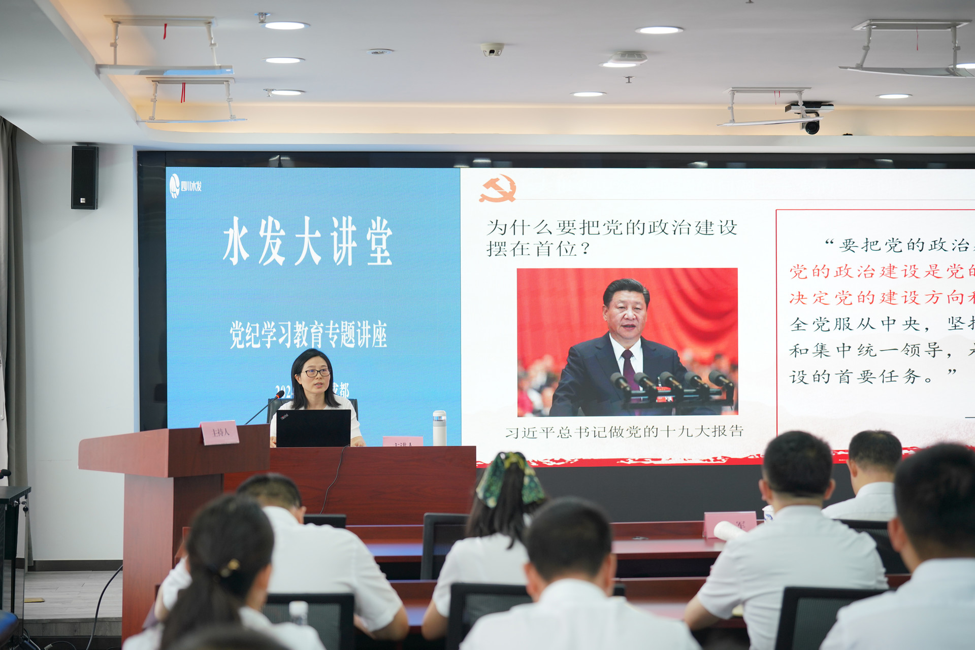 為深入學習貫徹新修訂的《中國共產黨紀律處分條例》,進一步強化黨紀法規意識,著力推進全面從嚴治黨,創新黨員干部理論學習的新載體、新路徑,5月17日,集團水發大講堂之“黨紀學習教育”第一期在集團總部開講。集團黨委副書記、董事、副總經理、總會計師尹曉東,集團黨委委員、紀委書記吳軍參加活動,集團總部、下屬企業黨員代表共計150余人通過線上、線下參加培訓。
