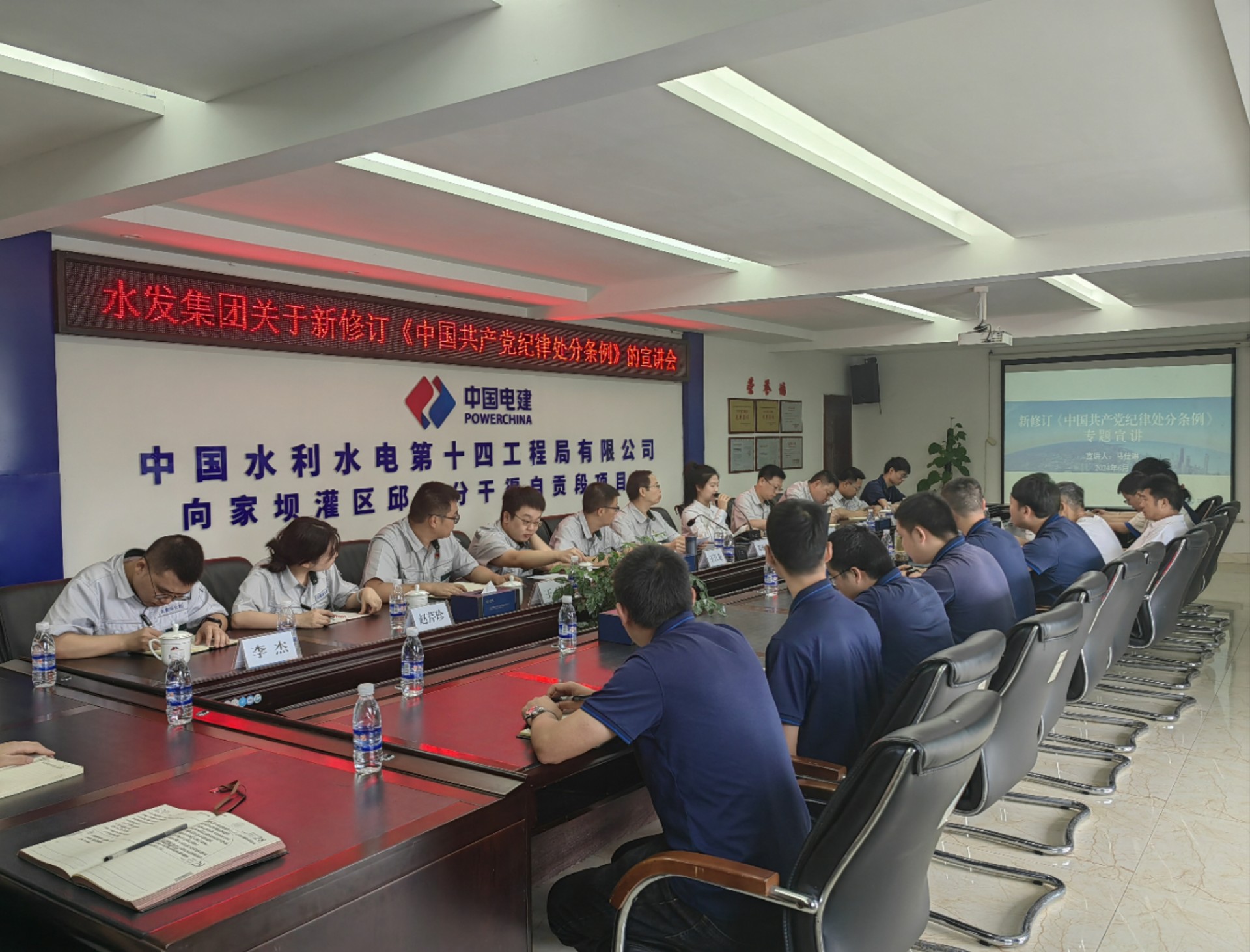 為深入學習貫徹新修訂的《中國共產黨紀律處分條例》(以下簡稱《條例》),推動黨紀學習教育走深走實,增強紀律規矩意識,筑牢廉潔思想防線,6月5日,集團紀檢監察部副部長羅超帶領集團黨紀宣講團成員赴向家壩灌區公司的向家壩灌區一期一步北一段中鐵十二局項目部、邱場分干渠自貢段水電十四局項目部和一期二步V標水發建設3個項目部為參建單位各黨支部宣講新修訂的《條例》。