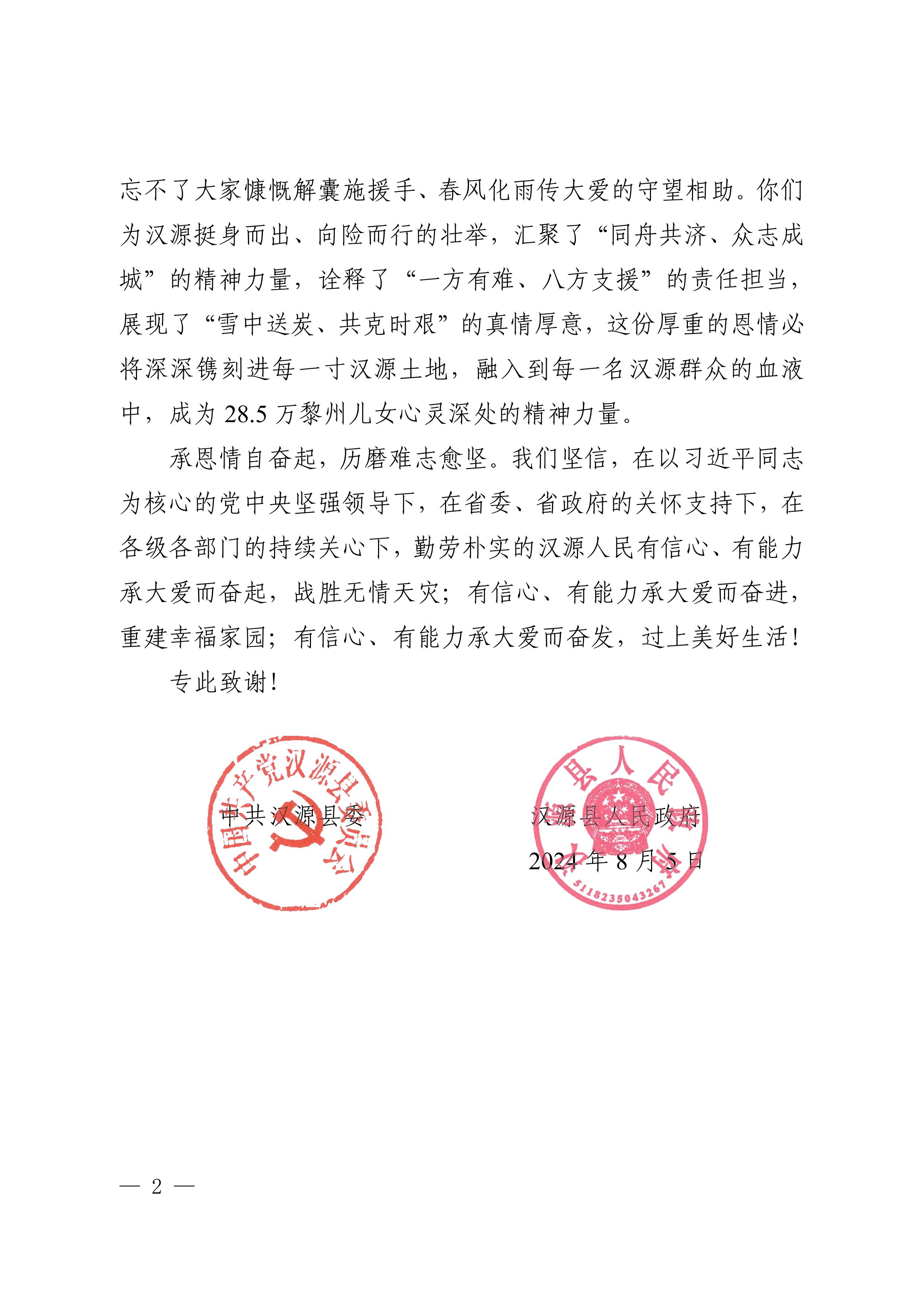 日前,集團(tuán)收到來自中共漢源縣委、漢源縣人民政府的感謝信,信中對集團(tuán)在“7?20”漢源縣馬烈鄉(xiāng)突發(fā)山洪泥石流災(zāi)害應(yīng)急搶險救災(zāi)中迅速響應(yīng)、行動有力表示了衷心的感謝,對搶險人員的日夜堅守和全力以赴表達(dá)了崇高的敬意。