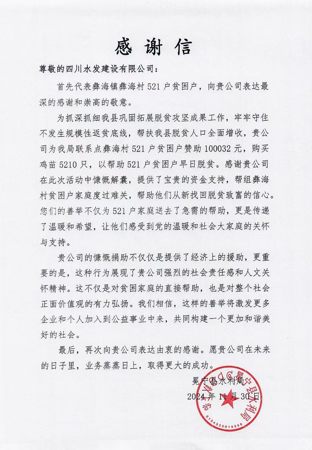 近日,建設(shè)公司收到了來(lái)自涼山州冕寧縣水利局的感謝信,涼山州冕寧縣水利局對(duì)建設(shè)公司在冕寧縣彝海鎮(zhèn)彝海村開(kāi)展的系列幫扶舉措表示感謝。