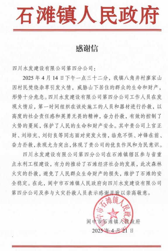 前不久,閬中市石灘鎮(zhèn)八角井村廖家山因村民焚燒雜草突發(fā)火情,火勢兇猛,迅速向民宅蔓延,情況萬分危急。建設(shè)公司四分公司青年突擊隊聞令而動,化身逆火而行的“鋼鐵戰(zhàn)士”,攜帶滅火器材奔赴火場。面對熊熊烈火,他們無畏無懼,手持鐵鍬、鋼鏟奮力清理可燃物,于上風(fēng)口處奮勇?lián)浯蛎骰穑会槍饎葺^大區(qū)域,熟練使用滅火器進行重點攻堅,并安排專人嚴密巡查,杜絕復(fù)燃隱患。在這場與時間賽跑、與烈火較量的戰(zhàn)斗中,青年突擊隊以專業(yè)的救援能力和頑強的拼搏精神,成功控制火情,為保障群眾生命財產(chǎn)安全筑起堅實防線,用實際行動詮釋了“水利鐵軍”不畏艱險、沖鋒在前的奉獻擔(dān)當(dāng),贏得了閬中市石灘鎮(zhèn)人民政府的高度贊譽與真摯感謝。